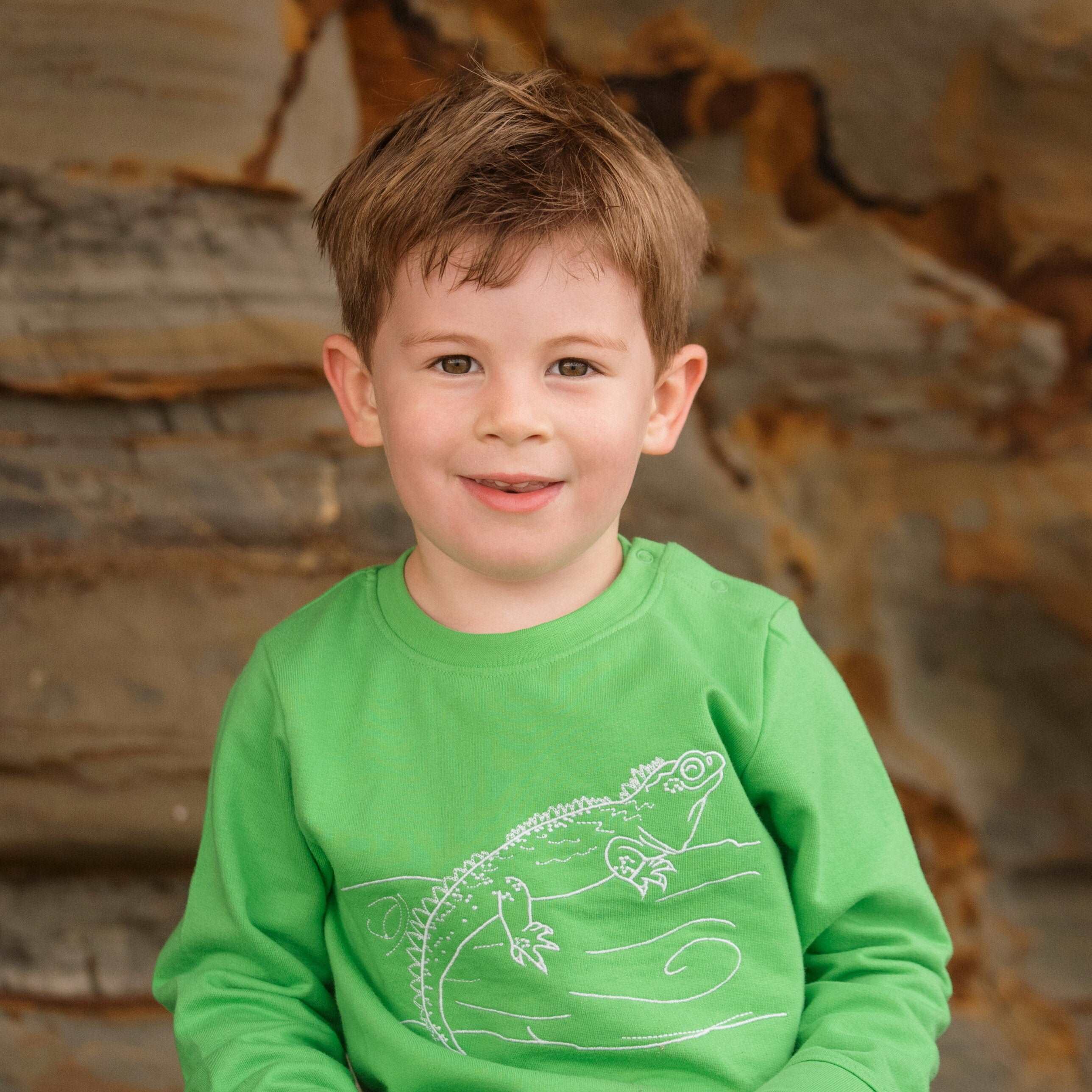 The magnificent green Organic Cotton Tuatara Fleece Jumper is our nod to this unique native! Tuatara are a rare reptile found in the wild only in New Zealand. They are the last survivors of an order of reptiles that thrived in the age of the dinosaurs.